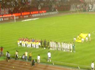 試合前の整列。緑のピッチに赤いユニフォームが良く映える。