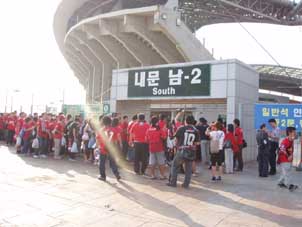 | スタジアム到着。バスから降りる。 | 何という長さの列。いったい何人いるのか。 |