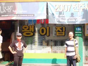 | 祝勝会はプルコギの店で思う存分飲んで騒いだ。 | お店の外で記念写真。 |