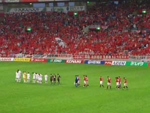 | 整列する選手達に惜しみない拍手と歓声が注がれる。 | ポンテへの感謝を込めて勝利の歌を歌う。 |