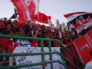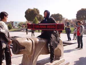 | イランの人は写真好き。どこでもすぐに撮影会になる。 | 女子高生に大人気だったレッズサポ。交流に一役かった。 |