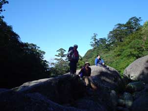 | 大きな切り株にもぐり込んで観察している杉谷さん。 | やっとの思いで大株歩道まで下って、ほっとひと息。 |