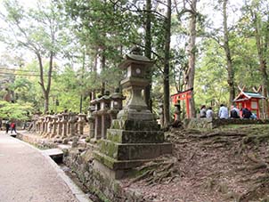 | 全国の大名から寄進された石灯籠が並ぶ。 | 手水舎は鹿の像から水が出ている。 |