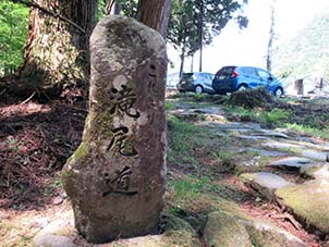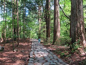 | 太い杉の横でパチリ。この古道には巨大な杉並木がある。 | 石段も風情がある。信仰の道だ。 |