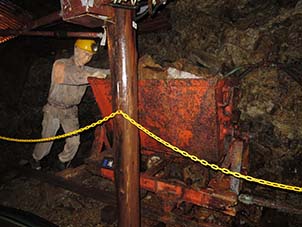 | 青い銅鉱石が露出した岩盤天井。 | 手押しのトロッコ。トロッコには1トンの鉱石が入る。 |