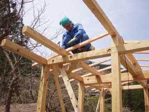 ンチの釘で打ち付け、セゴ板を張ります。下で切ってもらった板を屋根に張り続けます