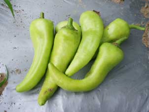 | ニラの茎が収穫出来ました。これは炒めて食べる予定。 | カラーピーマンも赤くなる前に収穫です。 |