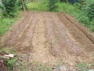 ・ブロッコリーの畝作り2本、元肥入れ、苗の定植21本、水やり、寒冷紗かけ
