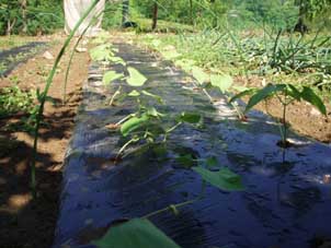 | ゴボウが大きくなってまるで木のよう。 | カボチャもグングンツルを伸ばしてます。 |
