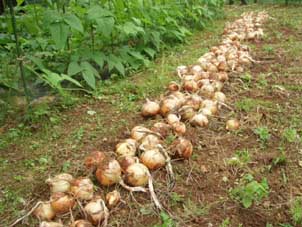 | 玉ねぎを掘り起こして日に当てて乾かします。 | ジャガイモの豊作に思わず顔がゆるみます。 |