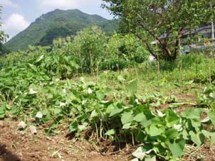 | サツマイモ畝の草取りがやっと終わった。 | 落花生が花盛りになっている。 |
