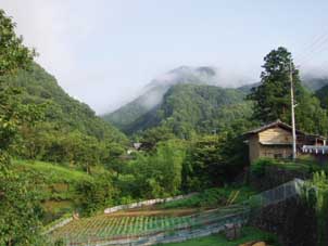 | 朝の山にはまだ雲がかかっている。涼しい。 | サトイモがグングン伸びてきた。夕立が多いのだろう。 |