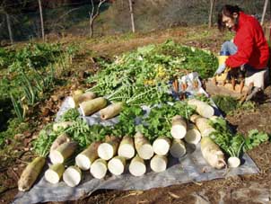 | 大きいので半分に切った大根。切り口を日に当てて乾かす。 | 赤カブは4個ずつ入れる。 |