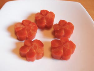 【ねじり梅】金時ニンジンを輪切りし、梅型に形を作り、浅くねじり 包丁を入れる。出汁と砂糖で他の煮物とは別に小鍋で煮て、冷ます。 |