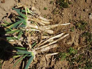| 玉ねぎの一畝はマルチが飛ばされていた。 | 寒風の中に孤高の大根。本日めでたく全収穫。 |