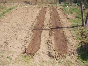 | 重労働の畝切り。鍬で深く穴を掘る。腰が痛くなる。 | 穴に元肥として落ち葉堆肥、苦土石灰、化成肥料を入れる。 |