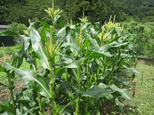 | ネギは雨が多いと元気がなくなる。 | トウモロコシの生長が遅い。やっと花が咲き出した。 |