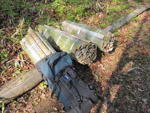 | 2ヶ月乾燥させた竹杭だが、全然軽くなっていなかった。 | コシアブラが出ていたので、天ぷら用に4房頂いた。 |