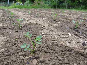 てた落花生苗を植え付けた。3月から土作りをしていた場所を再度耕耘し、ポット苗を