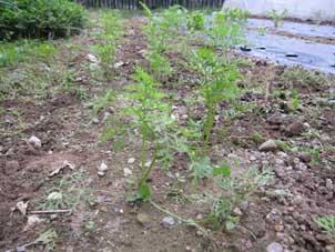 | 虫やコオロギに食われないように寒冷紗を埋め込んだ。 | 少しだけ出た人参がやっと育ち始めた。 |