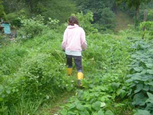 | 雨が多くて草が伸び放題です。草取りが大仕事です。 | この雑草の海にカボチャが沈んでいます。 |