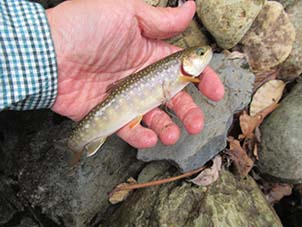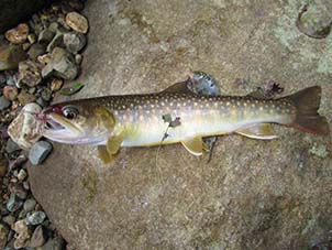 | 背中が曲がった岩魚が釣れた。変な気分になる。 | こんなチビが次から次へと・・・ |