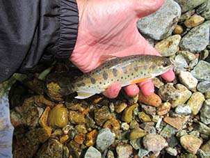 | 真っ黒い岩魚が釣れた。まだ魚が動いていないようだ。 | 淵には尺はあろうかという魚が何匹も泳いでいる。 |
