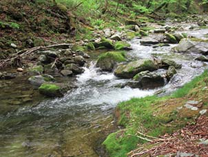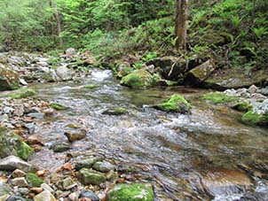 | 林道終点から橋を渡って歩き出す。水は少し少なめだ。 | 林道から見下ろす渓流。綺麗な流れが目を楽しませる。 |