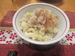 | ミズを茹でておひたしにした。 | 筍を刻み、油揚げを刻んで炊いた炊き込みご飯。美味い。 |