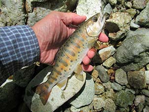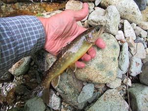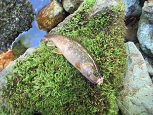 | 見切られることが多いが、繰り返すと岩魚が釣れる。 | この岩魚も粘って釣った。 |