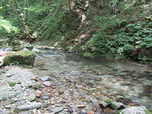 | 渓畔林の林床が素晴らしい。シダの群生で覆われている。 | 涼しい流れ。 |