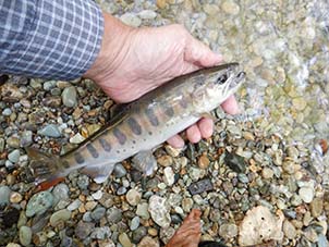 | 珍しくイワナが釣れた。まるまるしているイワナだ。 | しかし本当に綺麗な川だなあ。 |
