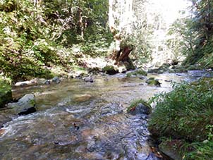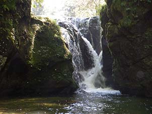 | 景色はいいのだが、魚の影はない。 | 突然現れた滝。ここは大高巻きを強いられた。 |