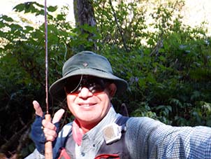 | イワナが釣れ続け、満足の自撮り。 | イワナの色が川の色と同化している。 |