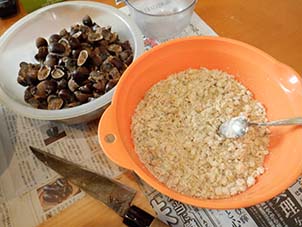 | 桧木内川支流で拾ってきた栗をよく洗う。 | 栗を茹でて包丁で切り、スプーンで中身をほじくり出す。 |