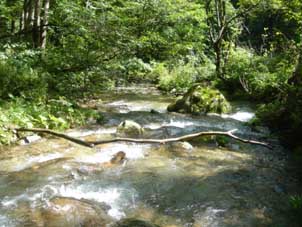 | 増水したO沢は手強かった。何とか手にしたヤマメ。 | 明るい日差しの下で枝を伸ばす「再会の森」 |