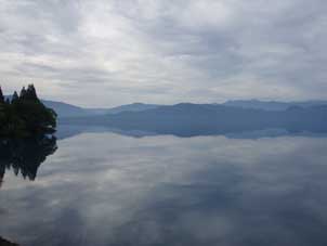 | 西木から遠野に向かう朝の田沢湖。 | 鏡のような湖面がまるで絵のようだった。 |