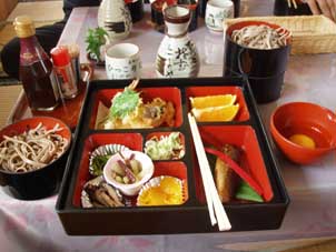 | 遠野市内でお昼、名物の「ひつこそば」を食べる。 | PONTAさんが尺岩魚をかけて格闘中。 |