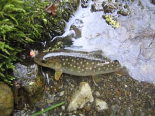 | 荒れた支流が多い中で、この美しさは貴重だ。 | いい型のイワナが釣れた。 |