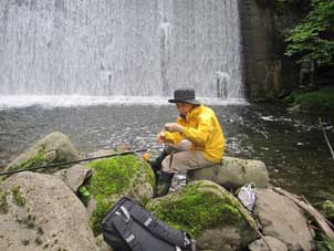 | 下流で釣りの準備をする加藤さんとイナさん。渓酔さんは見ている。 | この堰堤下の淵がポイント。昔、ここで良い釣りをしたらしい。 |