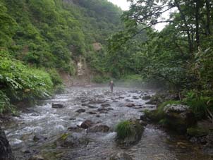 流へ入って見た。すぐに小さなイワナが釣れたが、その後はやはり魚の気配がなかった。