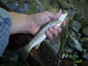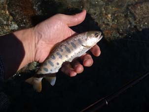 | 大きな堰堤の上からはイワナになる。 | 良型のイワナが釣れた。 |