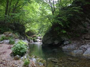 | この淵を最後に脱渓した。上流には二人の釣り人がいる。 | 下流に下ってすぐにヤマメが釣れて、判断に確信を持った。 |