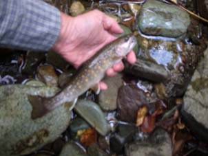| 念願の沢に下り立つ。いざ、最後の釣りを。 | 小さいヤマメが釣れた。なんときれいなこと。 |
