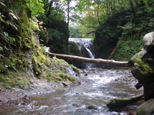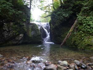 | 終了の場所、三段の滝が見えて来た。 | 滝で釣る加藤さん。私は大物をここでハリス切れさせた。 |