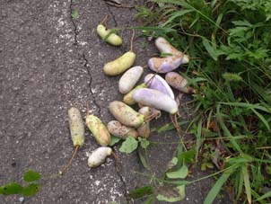 | 熊かと思ってびびったが、アケビ採りのおじさんだった。 | おじさんがアケビをたくさん分けてくれた。 |