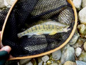 | 本命の川が先行者で入れず、転進した下流の風景。 | フライで釣ったヤマメ。これは2尾目。 |