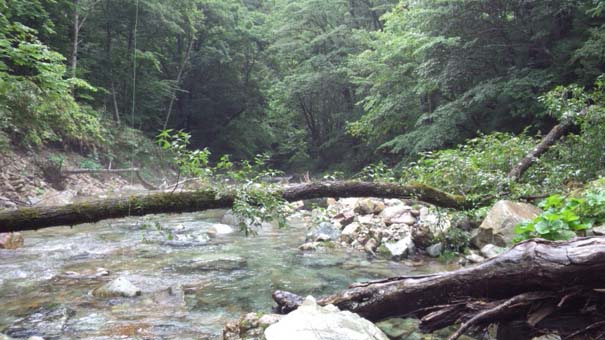 第一の橋から入渓する。水の量は平水出歩きやすい。新しいシューズが足に心地よい刺