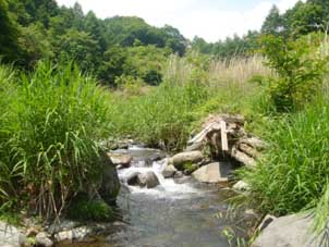 | 芦のいっぱい生えている川でクモの巣がいっぱい。 | クモの巣をかいくぐって釣った体高のあるアマゴ。 |