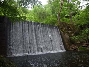 | 最後の堰堤。ここで大ヤマメをバラした。 | 林道を歩いて車に帰り着く。 |